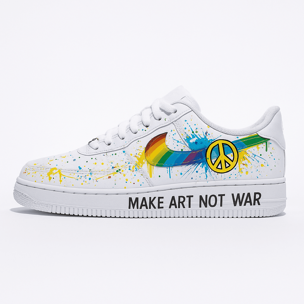 E sotto la suola, il messaggio inciso: Make Art Not War.
