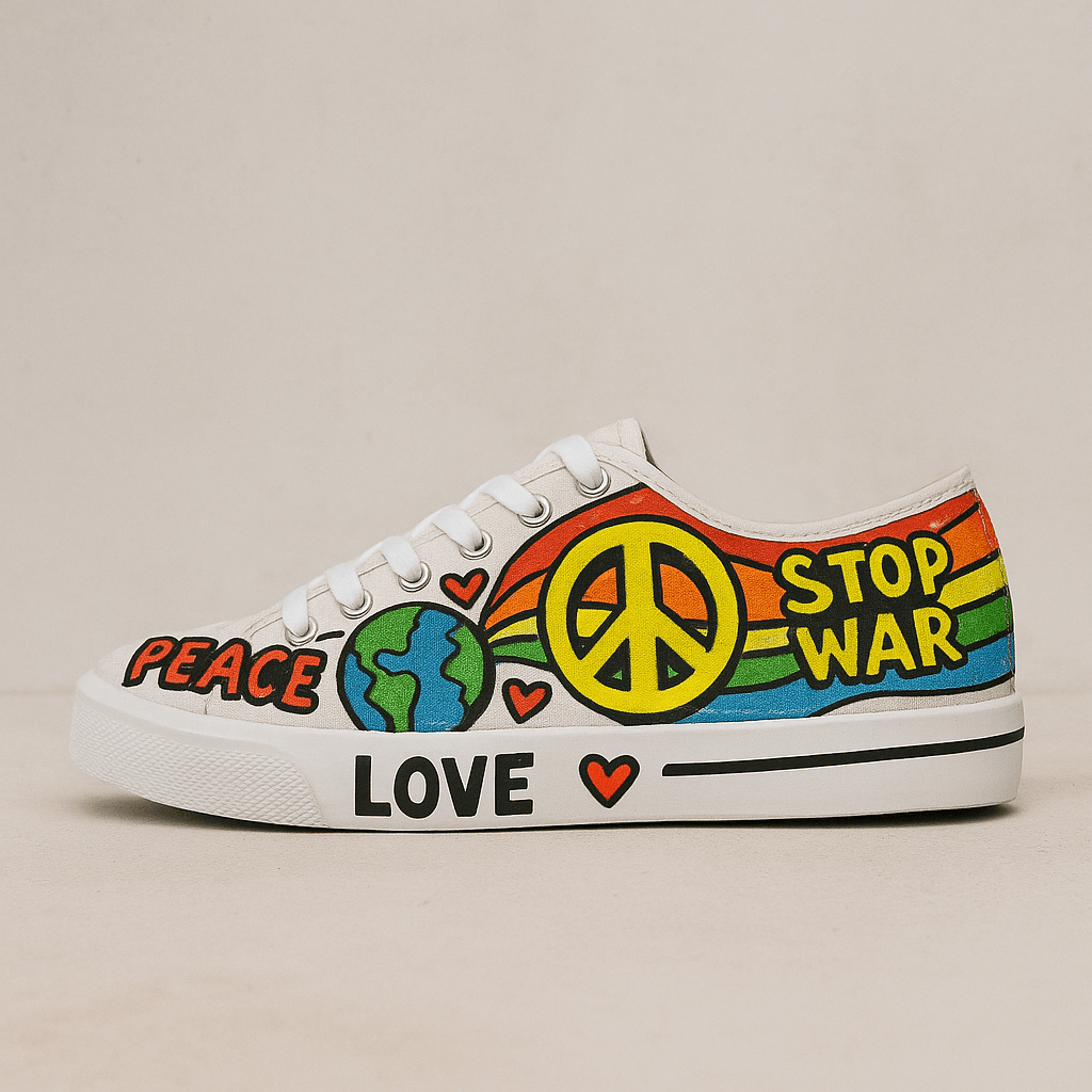 Colori grezzi, segni forti e simboli pacifisti che si intrecciano sul canvas, con la punta rivolta verso sinistra — perché chi sceglie la pace cammina controcorrente.